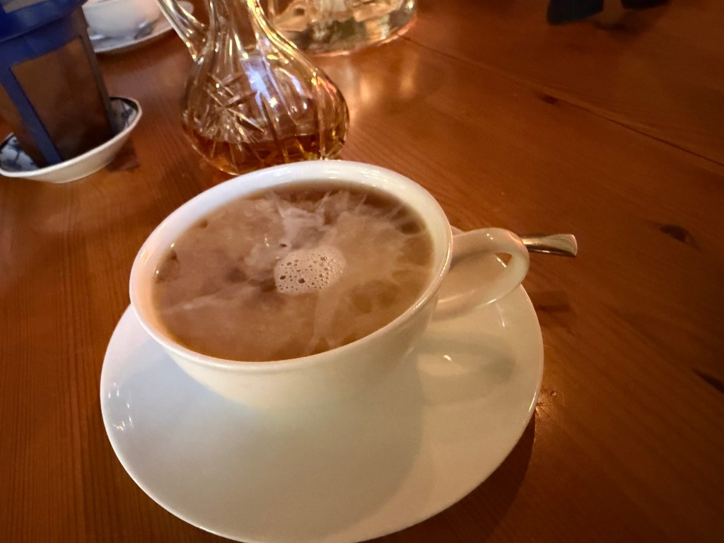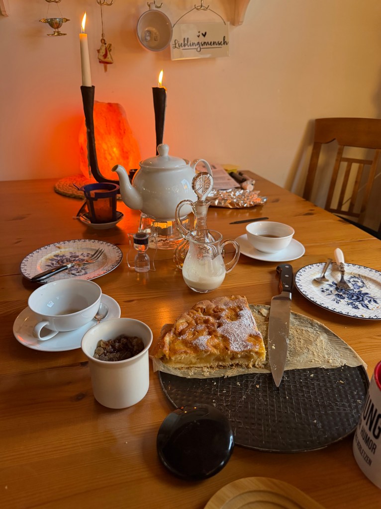 Nach getaner Arbeit treffen sich Arnt und ich abschließend zur alltäglichen Tee-Zeremonie in der Küche. Wir quatschen dabei über allerlei Kram und genießen dazu Tee mit einem Schuss Rum und Sahne sowie selbstgebackenen Kuchen.