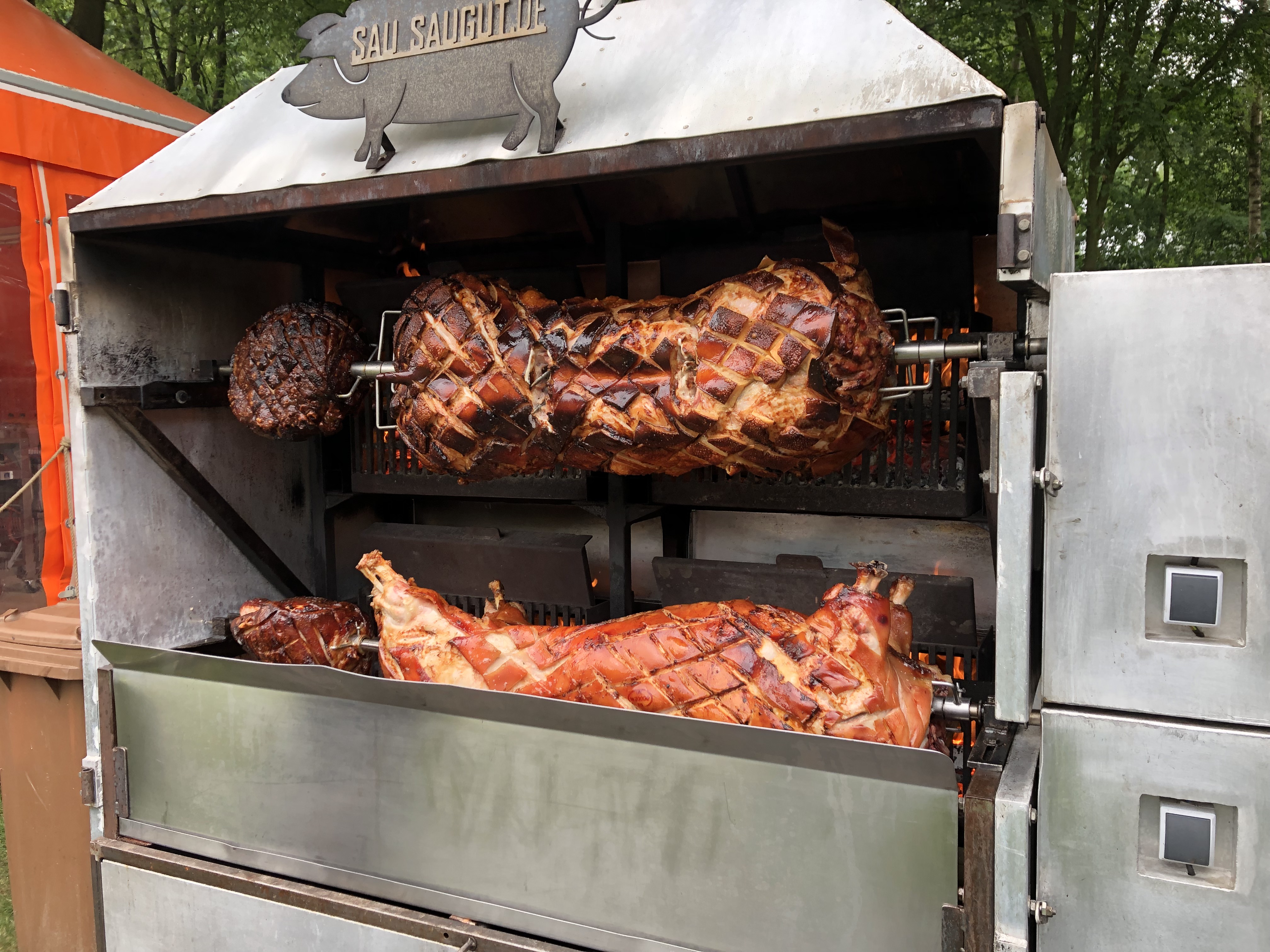 Schon allein der Grill ist anders als unser Sauengrill konzipiert und gebaut, schließlich hängt da viel Gewicht drauf und muss sich sicher und ohne zu schlagen drehen können.