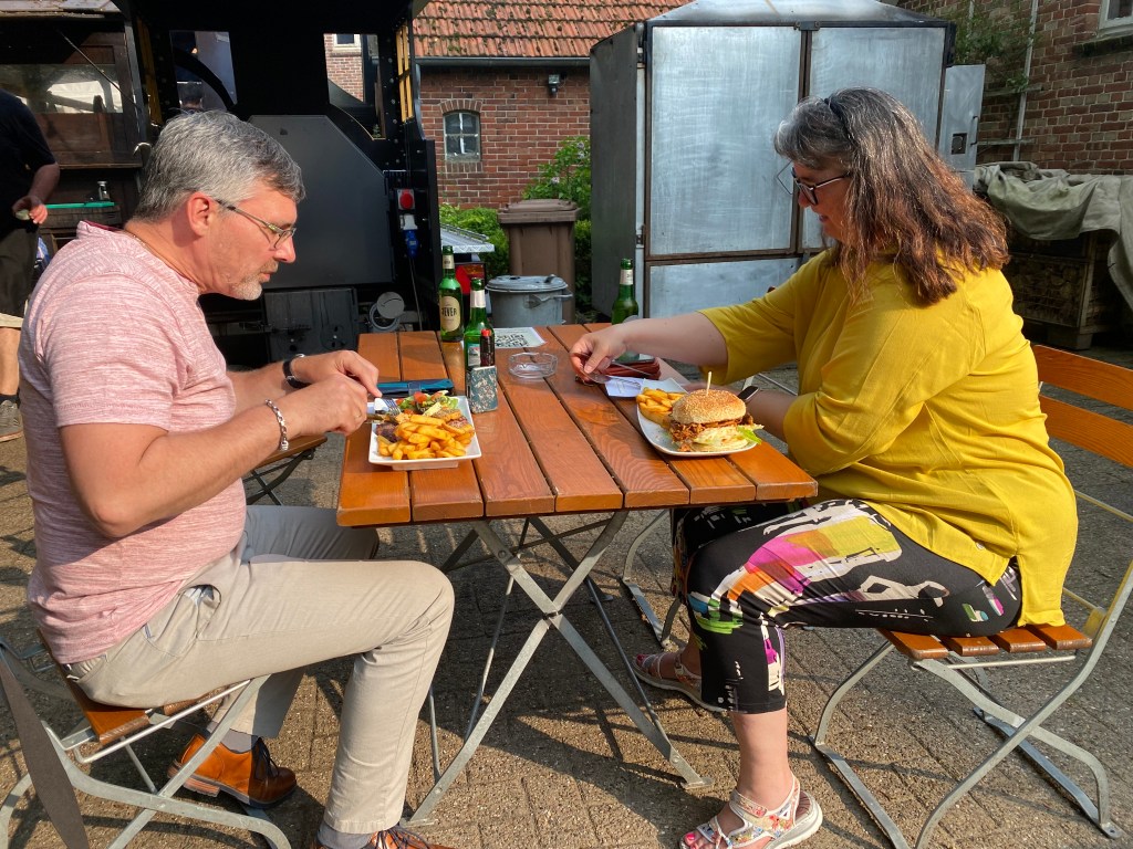 Fest steht, wir hatten Hilfe von allen Seiten. Bis zum Landrat selbst, engagierten sich ganz viele um den Erhalt des BBQ-Hofes. Von einem Gastronom bekamen wir sogar Geschirr und das, obwohl wir unmittelbare Konkurrenten wurden. Und von Christian – er kandidiert gerade zur Wahl in Bad Zwischenahn – kamen ausreichend Sitzgarnituren für den Biergarten und Zeltheizung für’s Bierzelt. Dirk, unser Nachbar half uns mit Radlader, die Holzschnitzel auf dem Gelände zu verteilen. Von seiner Ma bekamen wir Pflanzen, um es behaglich werden zu lassen. Jochen, der seinen Blumenladen in Zetel betreibt, verdanken wir den Blumentischschmuck. Und nicht zu vergessen unsere ganzen Zulieferer… Henning, unser Metzger und gute Seele, der uns mit Rat und Tat zur Seite steht, egal zu welcher Uhrzeit und unsere Bäckerei, die eigens für uns Brioche-Buns und vieles mehr backt. Unser Getränkelieferant von der Weindiele, der uns beratend zur Seite stand… und noch so unendlich viele mehr, die immer für uns da waren, wenn wir sie brauchten. Ja sogar das Gestüt Bruné und die Motorraddiele und wer sonst noch alles, baten ihre Hilfe an, als noch nicht klar war, ob wir hier einen Popup-Imbiss betreiben dürfen. Dieser Zusammenhalt war und ist einfach beispiellos. 💖