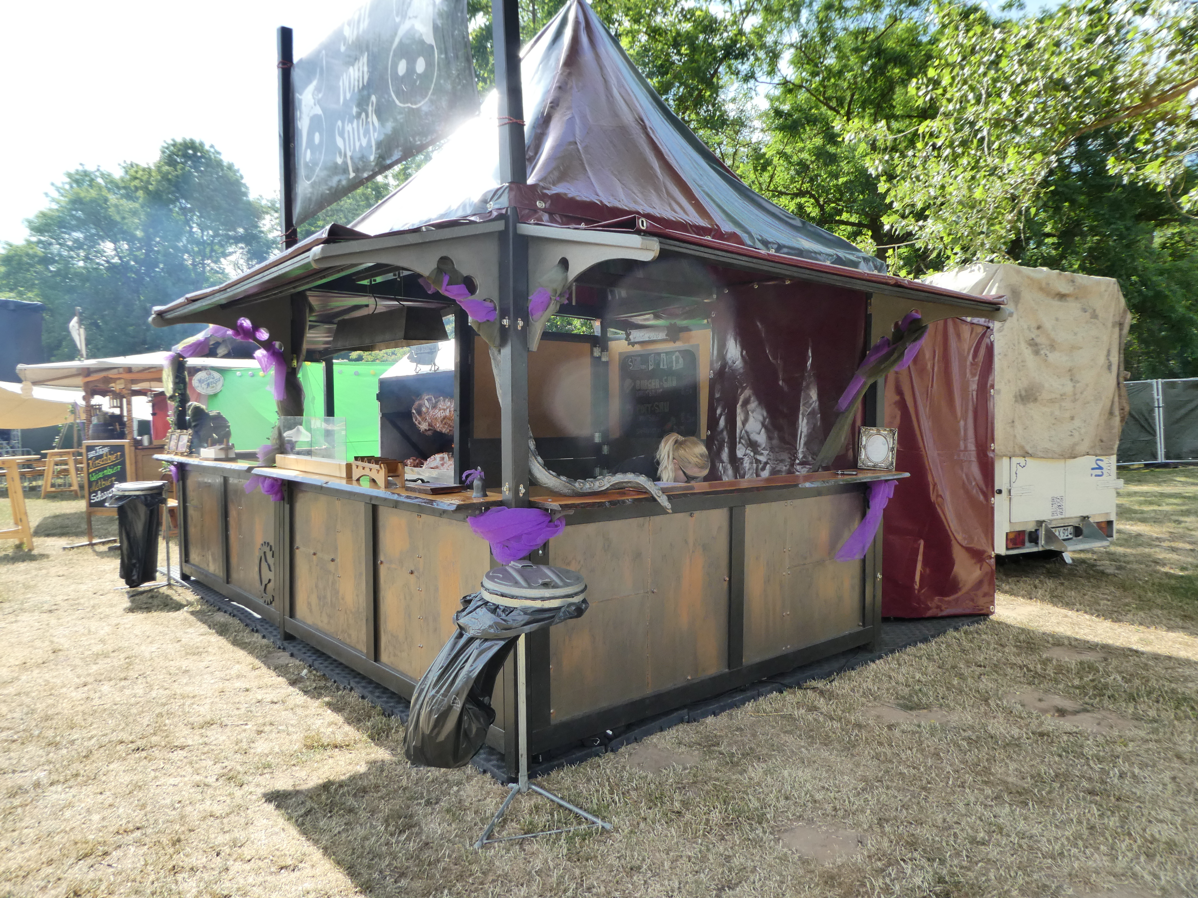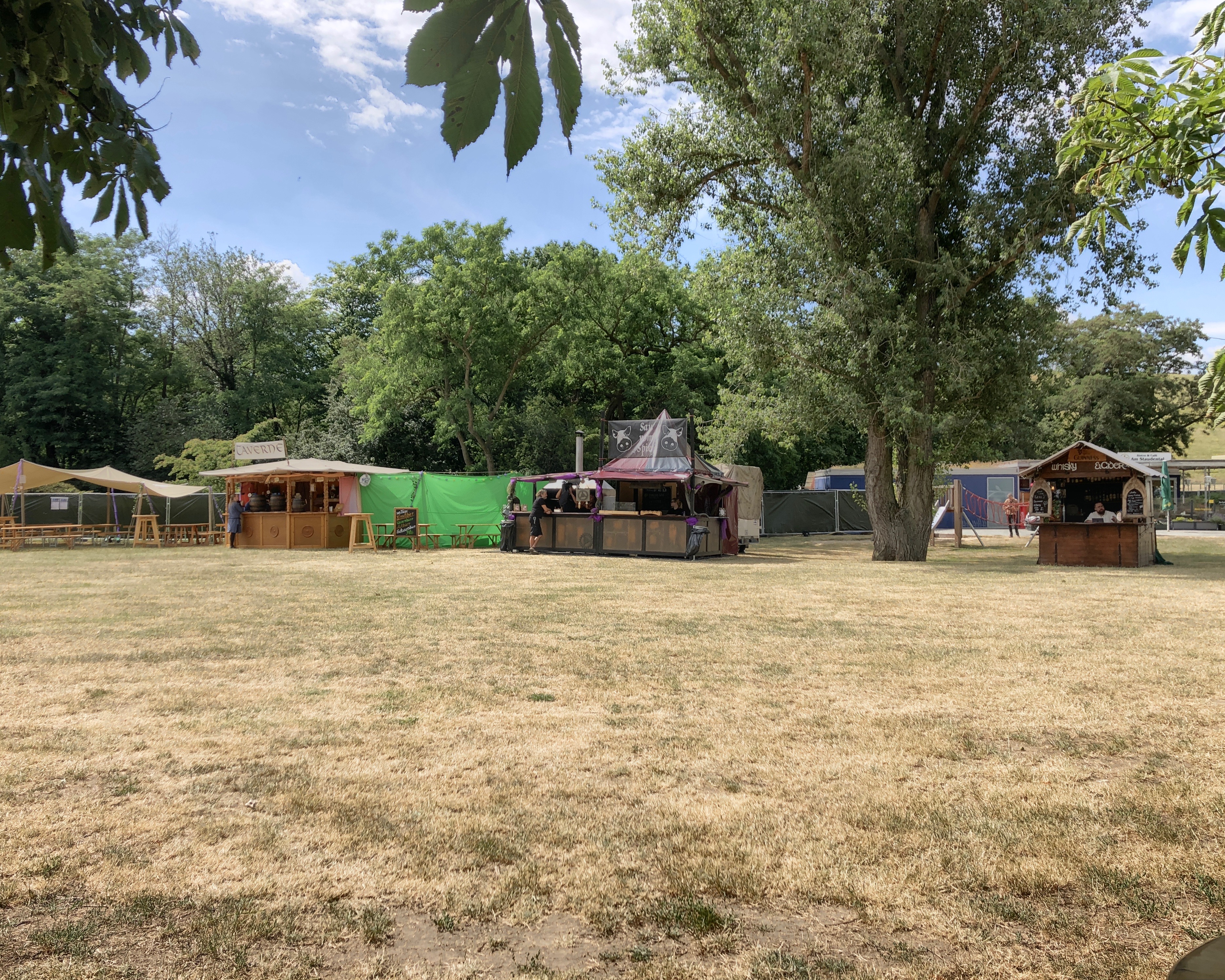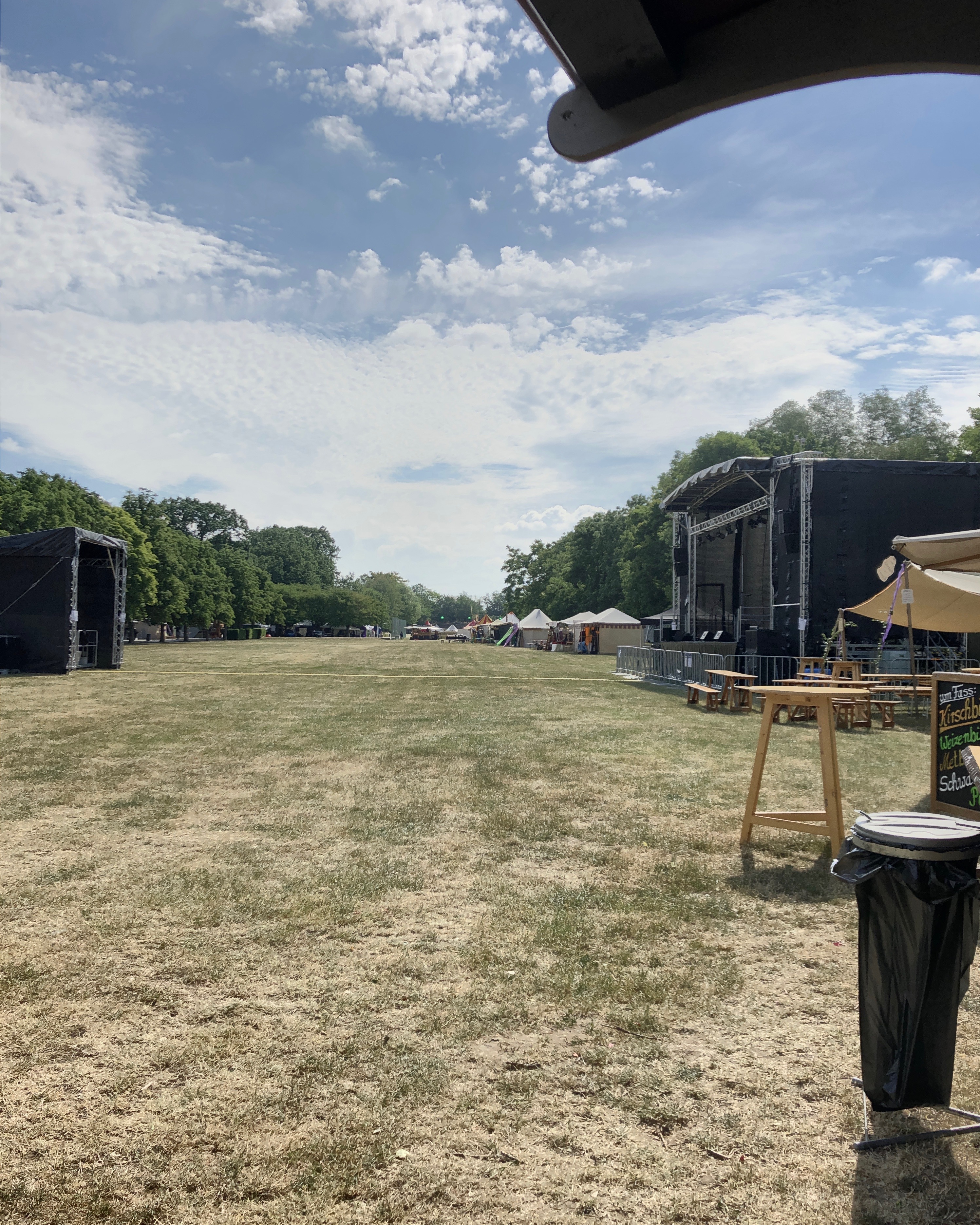 Und Gott lob regnet es nicht so viel – sonst würden wir noch zusätzlich im Schlamm versinken und dann geht da keiner mehr über die Wiese. Wir stehen ausgerechnet am Kinderspielplatz. Zwischen verwaister Bühne und Kindergeschrei. Unser Produkt passt überhaupt nicht dazu, der Whiskystand neben uns noch weniger… Hier würde ich allenfalls eine Wurstbude hinstellen – das mögen Kinder immer. Daher macht Tobi vom Bratwerk, der einzige Wurststand gegenüber von uns, am Lauf gelegen, auch guten Umsatz. Alle anderen, auch die am Lauf stehen, drehen weitgehend Däumchen.