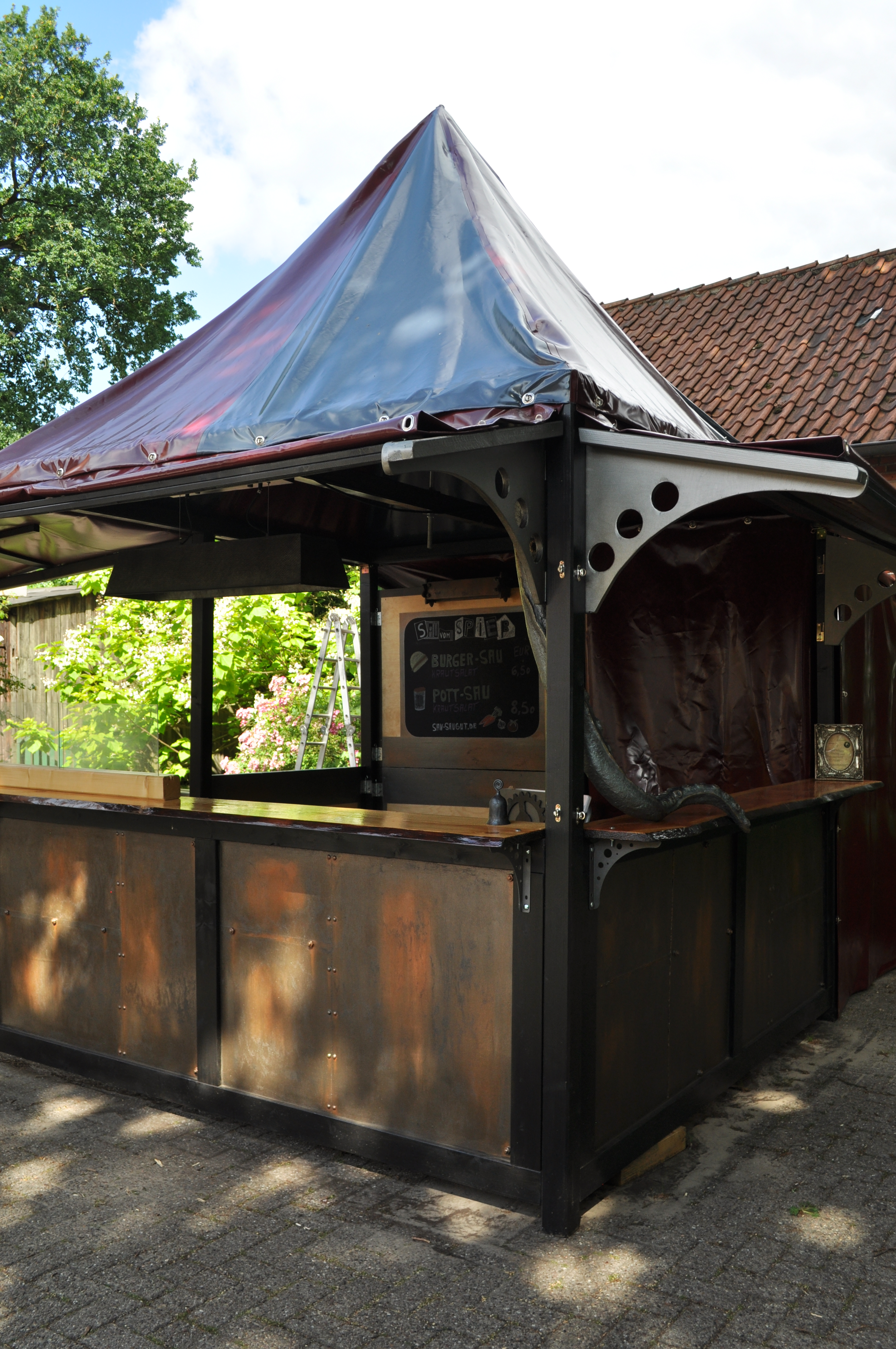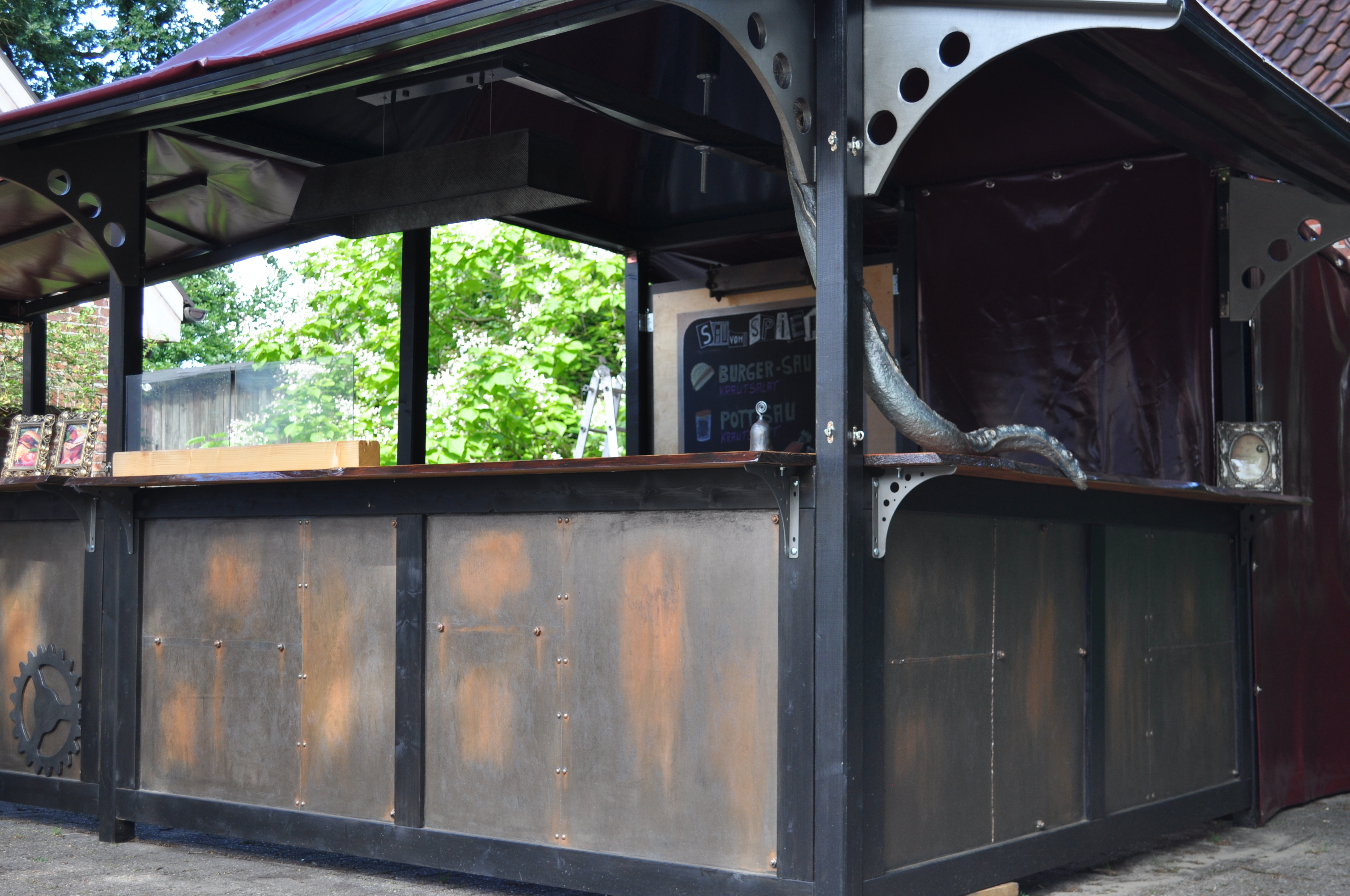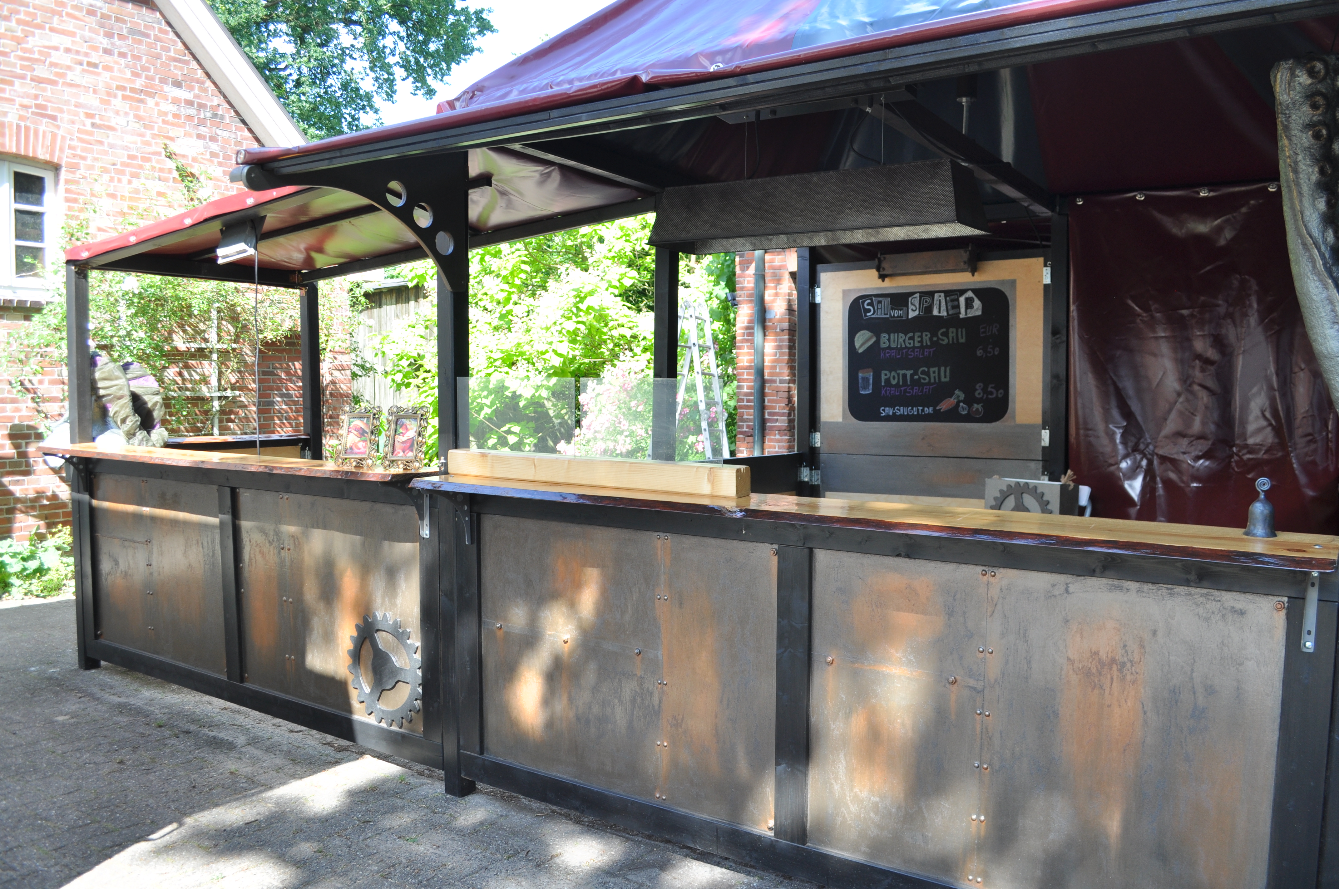 Der Stand wurde übrigens von uns selbst erbaut. Seit März bauen wir daran herum. Der Zuschnitt, das Holz für den Stand sowie die komplette Konstruktion hat mein Mann übernommen.