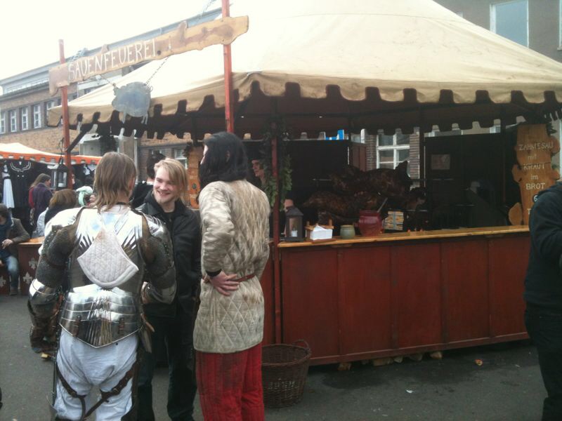 Im Stand ist uns die Kälte allerdings schnuppe. Unser Feuer, über die sich munter die Säue drehen, wärmt uns ausreichend.